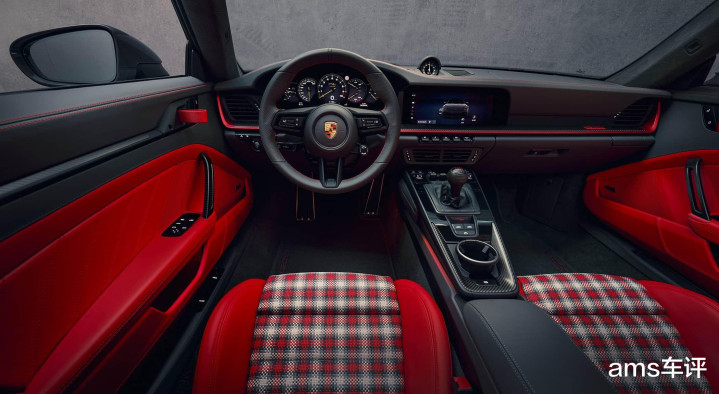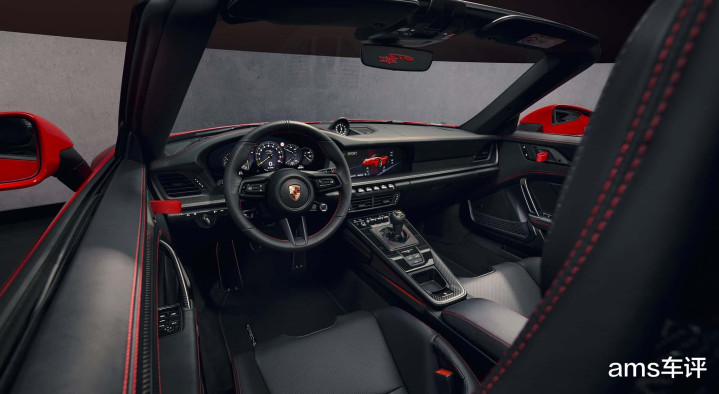 从座舱望去,是黑色真皮内饰和包覆打孔皮革的方向盘。其左侧通过旋转式点火开关启动车辆,而不是按钮。黑色前风挡框架和黑色防石击保护膜让人联想到911 Speedster。信息娱乐系统加入了AI语音控制支持,并显示一台与你所购买车辆颜色一致的3D模型,用于操作大多数车辆功能。