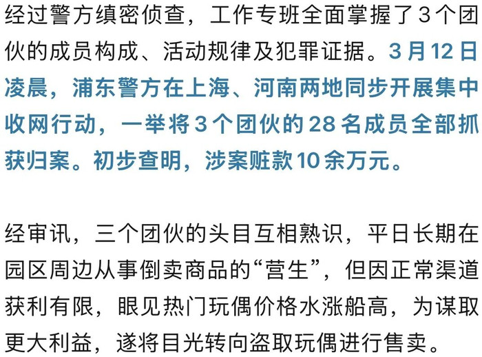 据报道,上海警方近期成功捣毁3个专门盗窃玩偶的犯罪团伙。他们屡屡在上海迪士尼乐园盗窃商品,将单价300元左右的商品以30元的低价就地或者附近向游客兜售,以此牟取暴利,涉案赃款10余万元。目前,3个团伙的28名成员均已被采取刑事强制措施。