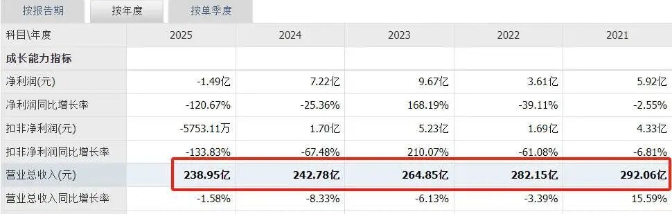 具体而言,光明乳业2022年营收282.15亿元(同比下降约10亿元),2023年降至264.85亿元,2024年进一步下滑至242.78亿元,2025年为238.95亿元,营收逐年收缩,发展压力明显承压。这几年,光明的业绩用“每况愈下”来形容也不为过。