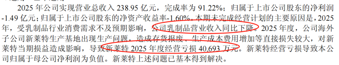 2025年,光明乳业位于新西兰的乳业公司新莱特生产基地出现问题,导致存货报废、生产成本大幅增加,全年亏损4.07亿元,这笔亏损直接抵消了母公司的全部盈利。新西兰的海外基地,光明已经布局了十多年,原本想效仿竞争对手布局海外奶源,打造“国内基地+海外资源”的发展模式,没想到这家子公司后来反而成为了业绩负担。