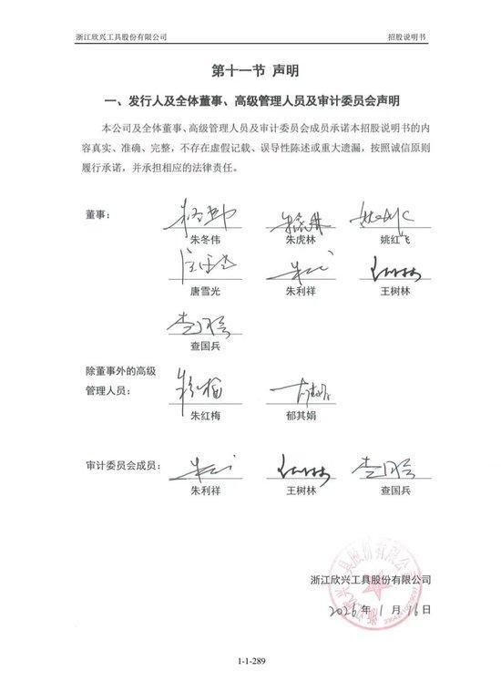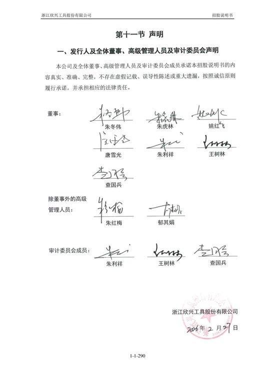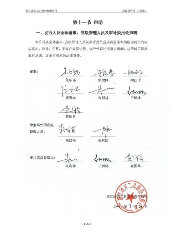 浙江欣兴工具招股说明书签字与公章对比分析