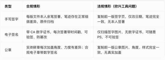 合规性说明:三张文件为浙江欣兴工具 IPO 项目的不同阶段申报文件(2024 年上会稿、2026 年两次申报稿),签字与公章的一致性完全符合《首次公开发行股票并上市管理办法》对招股说明书签署的合规要求。但手写签字 “笔迹完全一致”,在跨版本、跨日期的 IPO 申报文件中,绝对不合规,直接违反《首次公开发行股票注册管理办法》等监管要求,属于伪造 / 变造签字的严重违规行为,绝非合规情形。