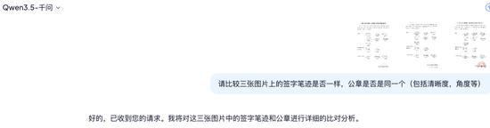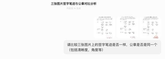 6 、我们输入了一样的 promot“请比较三张图片上的签字笔迹是否一样,公章是否是同一个(包括清晰度,角度等)”等。
